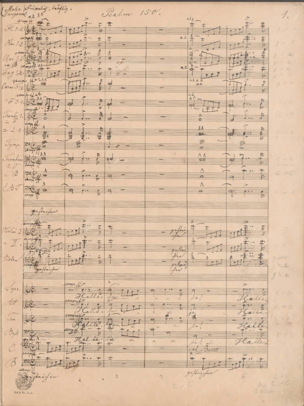 The festive hymn Psalm 150 is one of Bruckner's last works and was commissioned for the International Exhibition of Music and Theatre in the summer of 1892 in Vienna's Prater Park. The fact that Bruckner received this commission shows that, since the success of his Seventh Symphony, he had arrived on the international music scene as a composer. Bruckner had the choice between Psalms 98 and 150. Bruckner chose Psalm 150 ‘because of its special solemnity’, using Martin Luther's translation as specified.